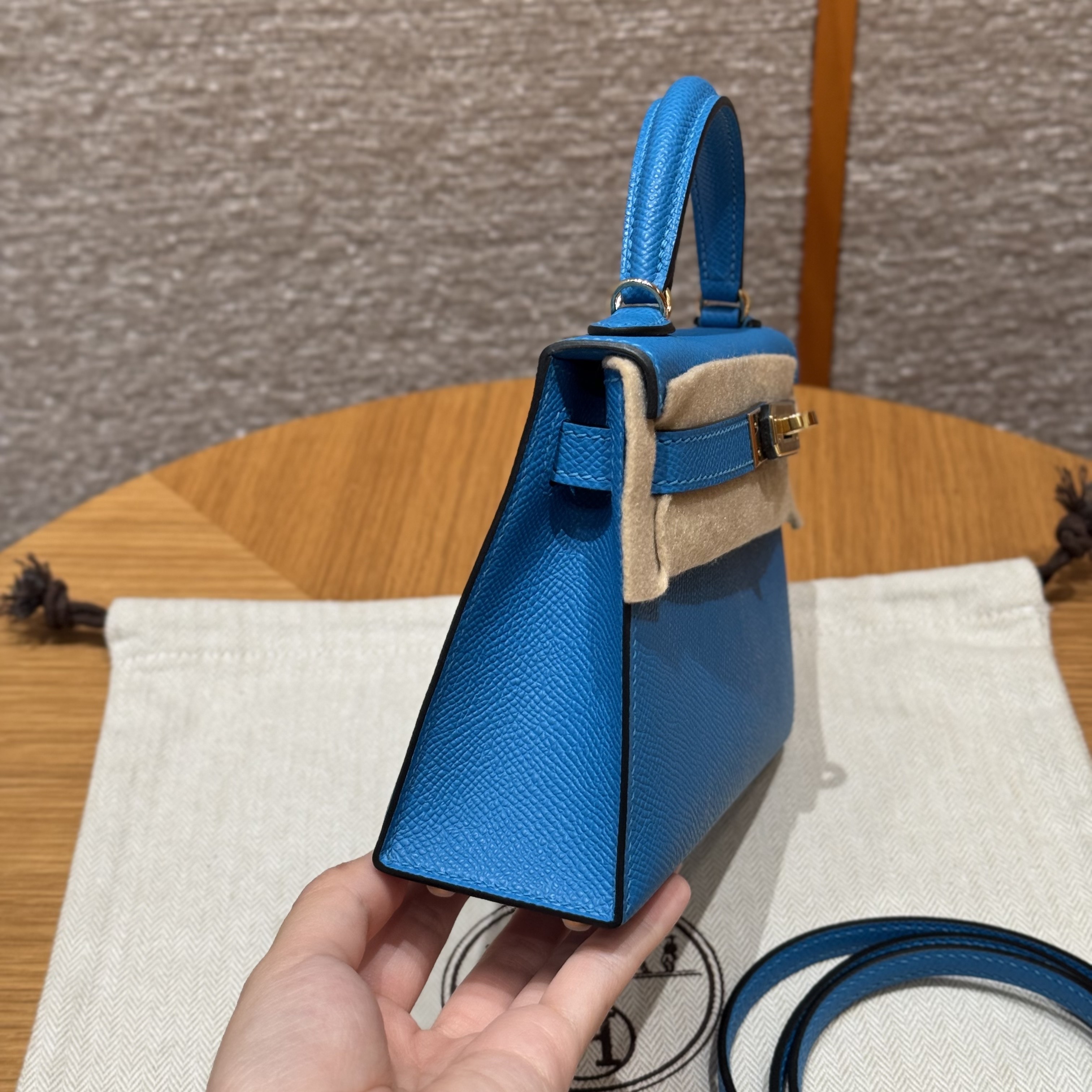 올수공 에르메스 미니 켈리 Blue Fruda 엡송 가죽 골드 하드웨어