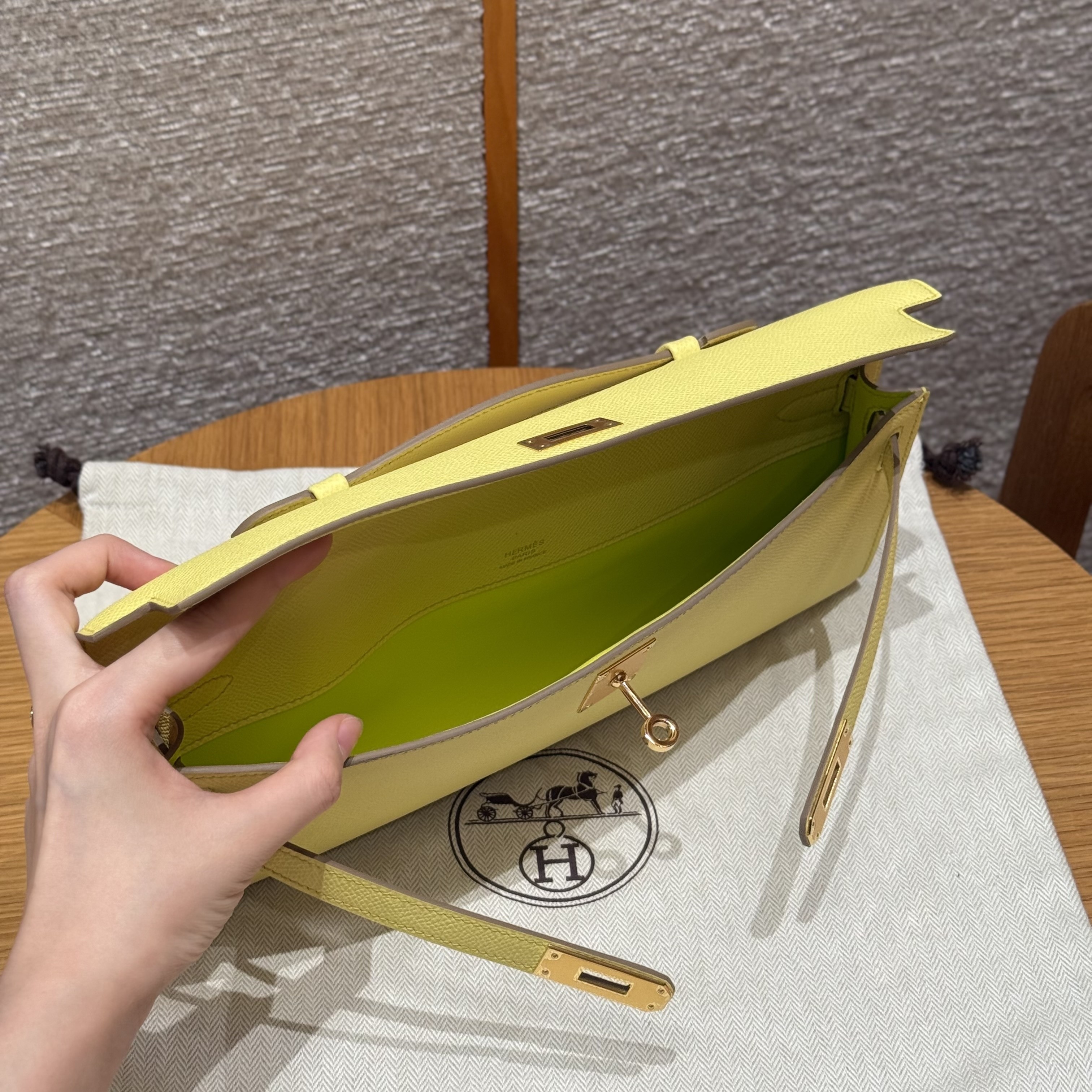 올수공 에르메스 켈리 컷 Jaune Poussin 엡송 가죽 골드 하드웨어