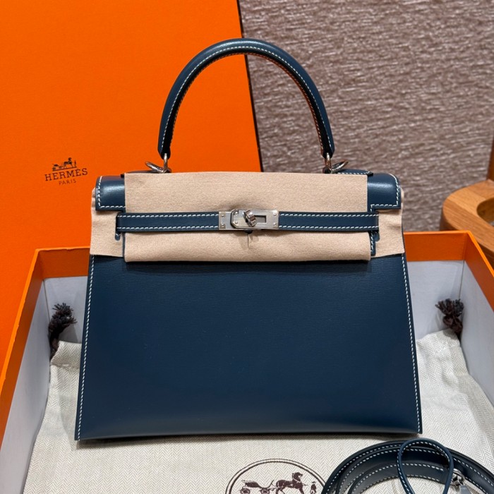 올수공 에르메스 켈리 25 7P/Blue presse 박스 가죽 실버 하드웨어