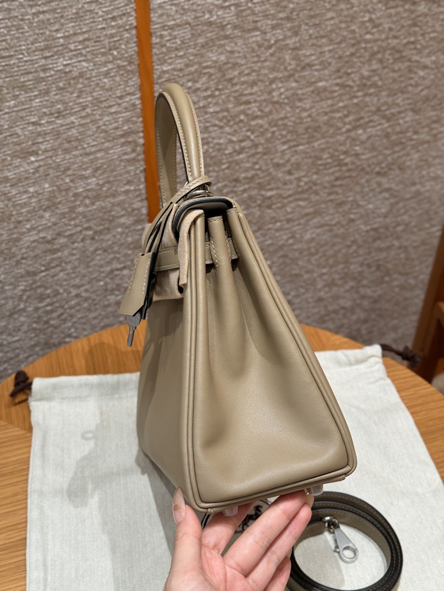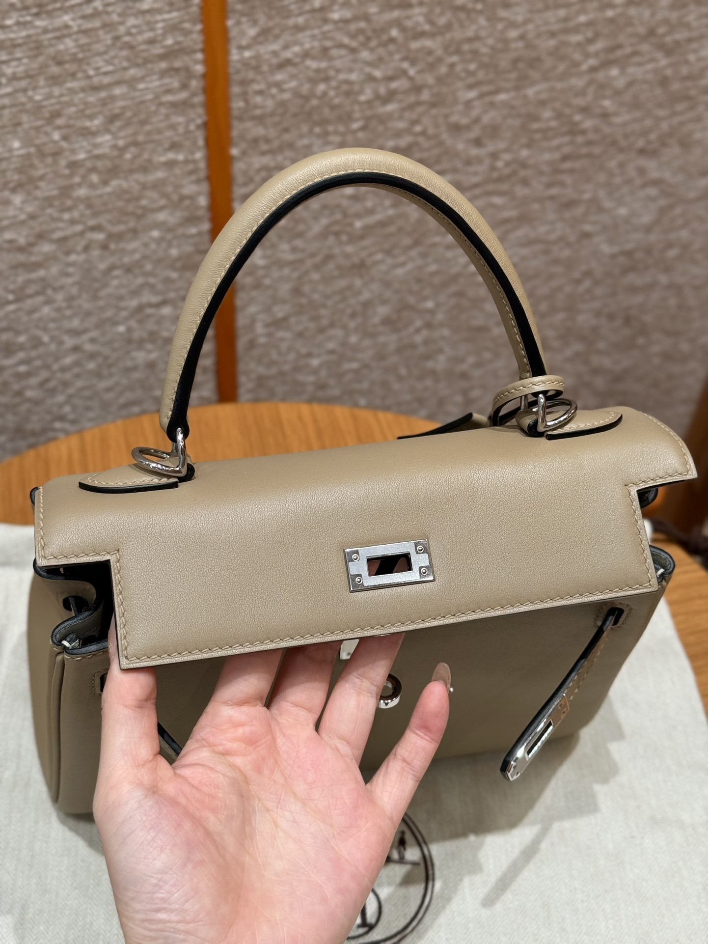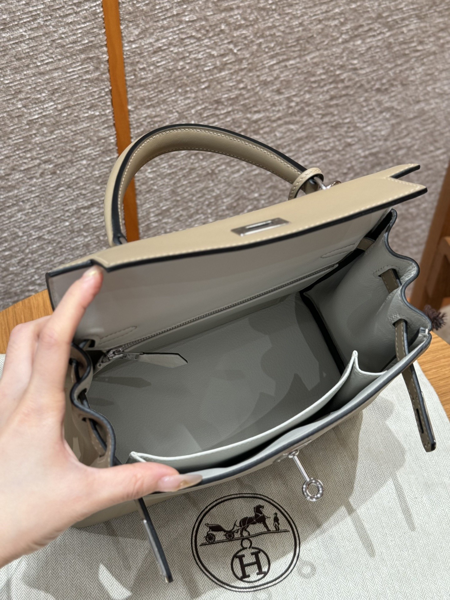 올수공 에르메스 켈리 25 8Q/Beige Marfa M4/Gris pale 스위프트 가죽 실버 하드웨어
