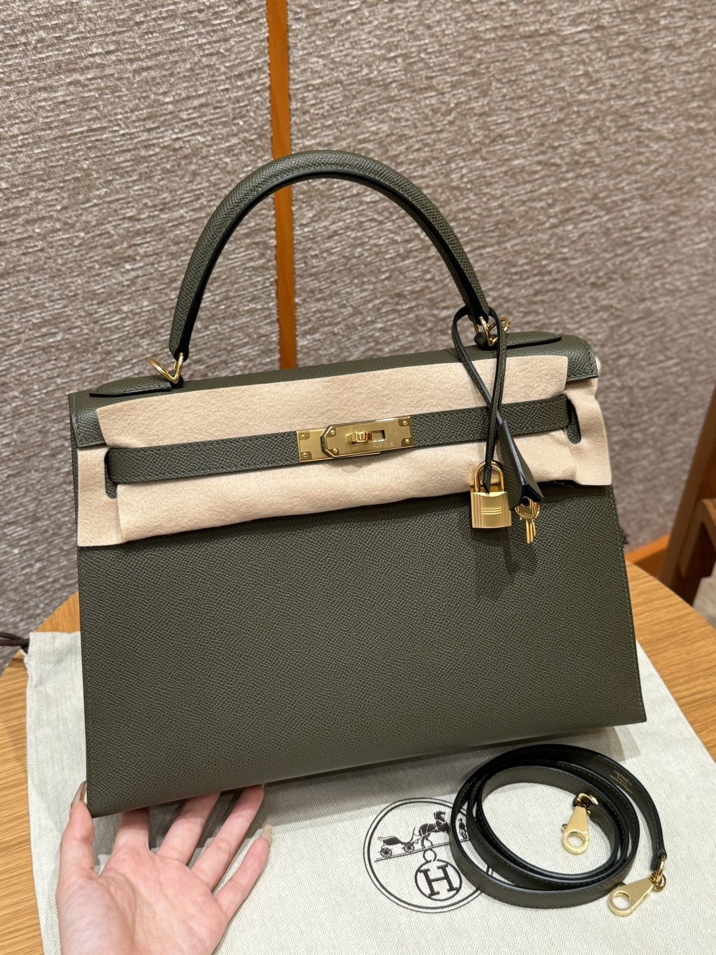올수공 에르메스 켈리 32 2Q/Vert Anglais 엡송 가죽 골드 하드웨어