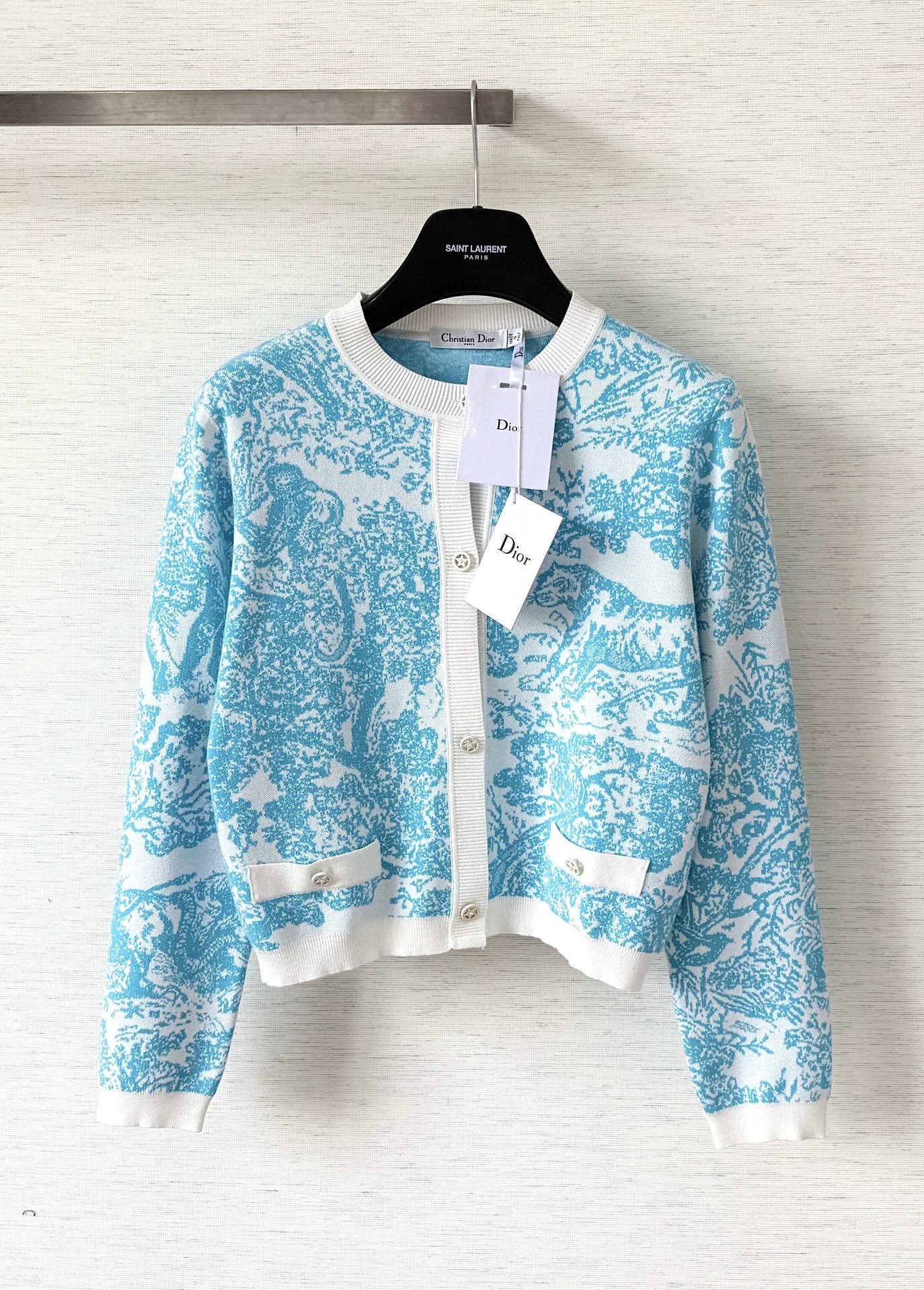 최고퀄 디올 Dioriviera 크롭 재킷 화이트 테크니컬 니트 & 은방울꽃 그린 Toile de Jouy Sauvage 모티브
